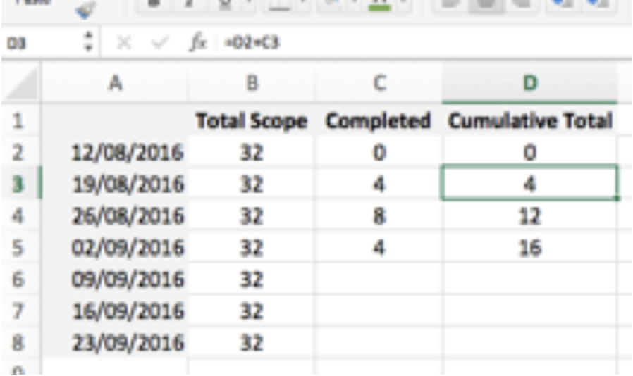 - If the scope changes, update the value in column B and extend the values in the same column for the remaining time ahead of the row that changed